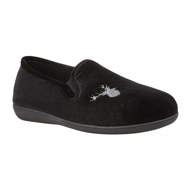 The Lotus Clarence black slipper is traditional in its styling and will appeal to refined gentlemen. Constructed with a plush velour upper that is enhanced by an embroidered stag’s head and featuring discreet elasticated side panels to help to get them on/off with ease, a practical rubber outsole and memory foam in-socks, this full shoe slipper is exceptionally comfortable and highly wearable.