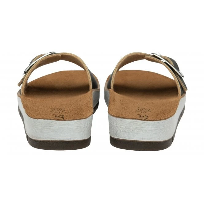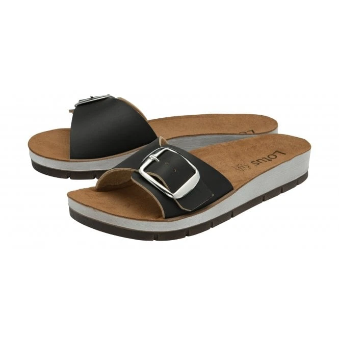 Your warm weather wardrobe is not complete without the addition of the Lotus Dasha sandal. This slip-on mule with a contrasting midsole boasts a leather footbed, whilst the faux leather upper is enhanced by a large, polished metal buckle. Team this Lotus women’s black sandal with your favourite casual looks on glorious sunny days and balmy nights!