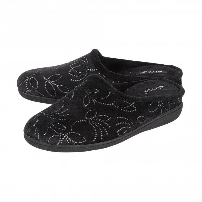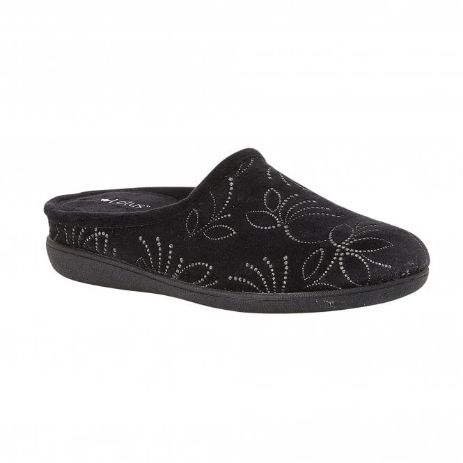 Giving the Lotus Elizabeth slipper a striking finish is a metallic foil embossed leaf design that is encompassed on the textile upper. This women’s, black, mule slipper also encompasses a wonderfully soft lining and memory foam in-socks to ensure that they are exceptionally comfortable and highly wearable.