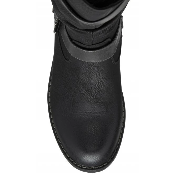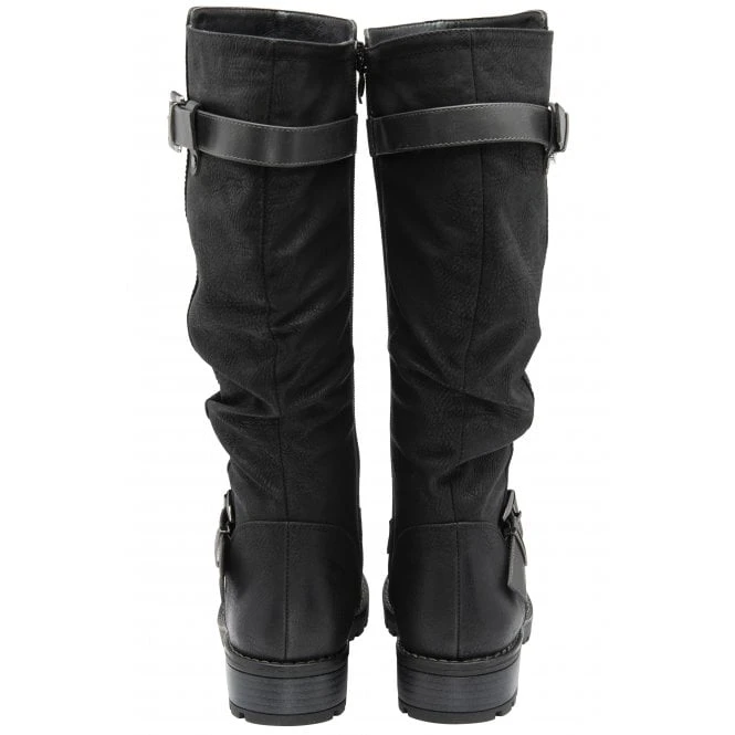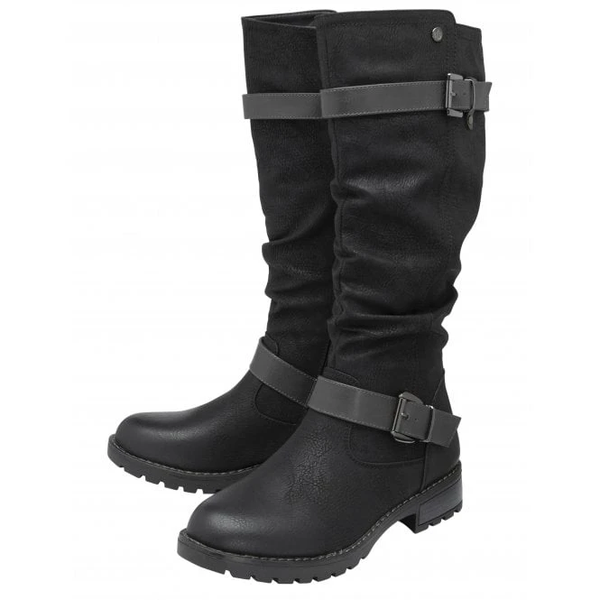 A welcome addition to all off-duty looks is the Robin knee high boot from Lotus. This casual women’s black boot boasts a slouch effect leg that is finished with grey wraparound buckle detailing. As well as featuring an inside zip to aid getting them on and off effortlessly, this striking round toe boot sits on a heavy cleated sole unit and a subtle 3.5cm heel.