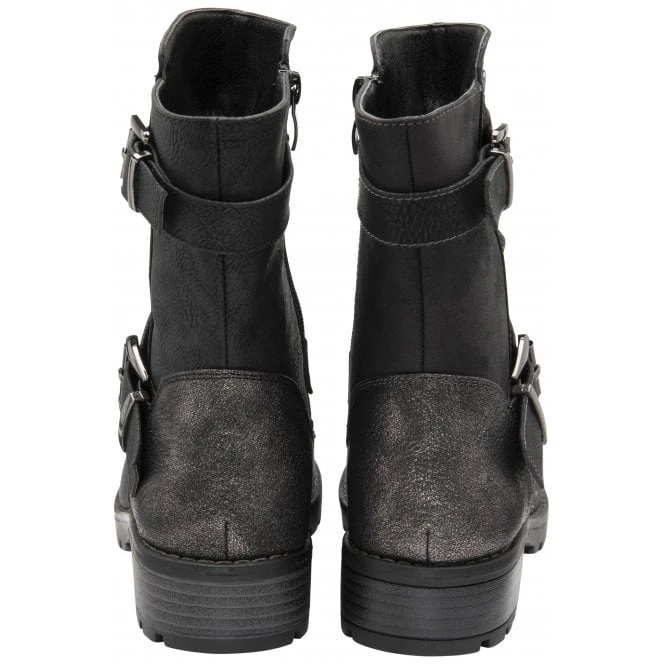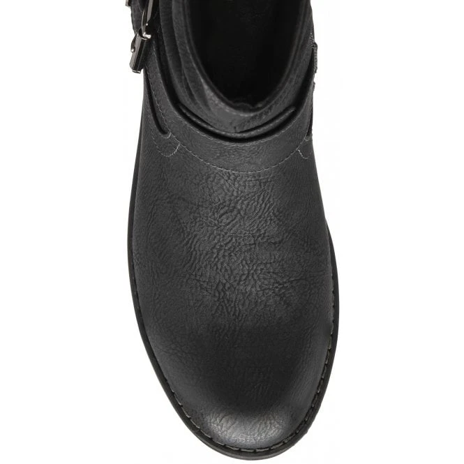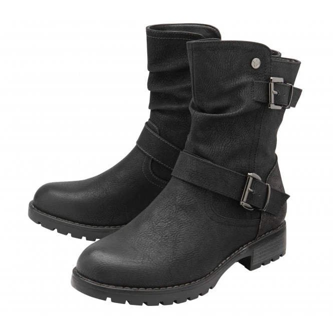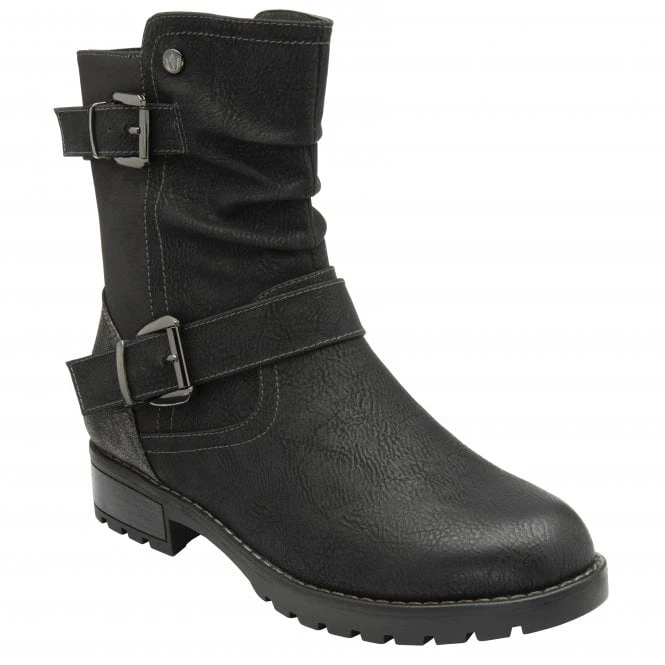 Imbue everyday looks with a fashionable edge with the Lotus Jamila boot. This women’s black boot sits just above the ankle and is finished with subtle ruche detailing, decorative buckles, a cleated sole and a slight 3.5cm heel. This faux leather ladies’ black boot has biker boot vibes and will certainly update any casual capsule wardrobe.