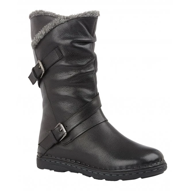 The perfect addition to your winter wardrobe is the highly wearable Lotus ladies’ Jolanda calf boot. Buckle and strap detail can be found on the slouched effect leather upper alongside a cosy faux shearling trim. These almost flat, women’s black boots are a cold weather essential that have a strong après-ski vibe.