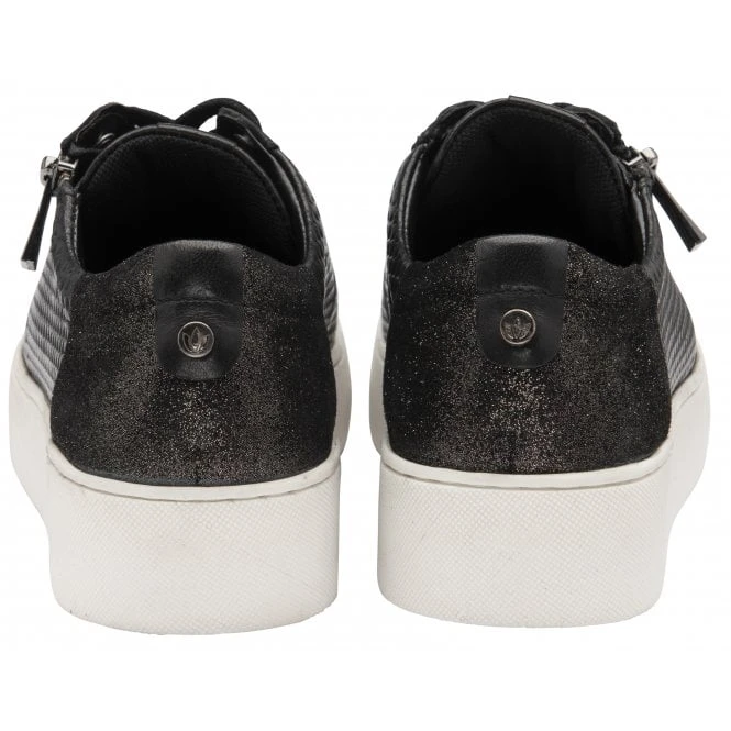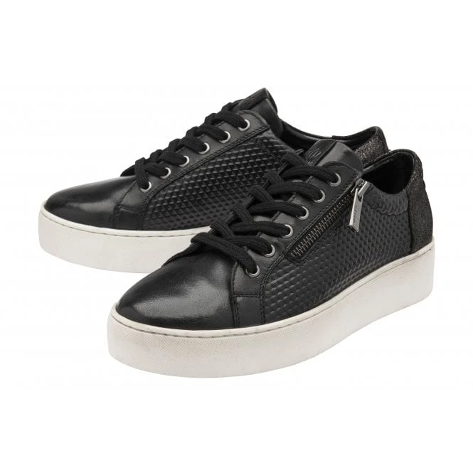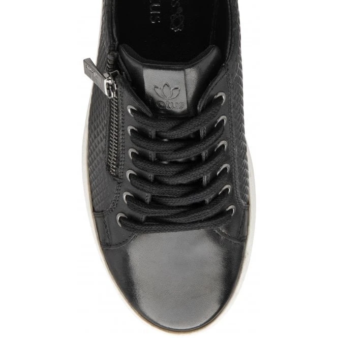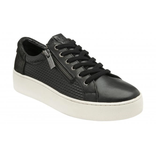 A striking new addition to the Stressless by Lotus collection is the Stroud trainer. This women’s black trainer is decoratively enhanced by an embossed geometric pattern on the side panel, a metallic heel counter that features branded metal hardware on a contrasting tab and a functional exposed zip. Crafted from premium leather and sitting on a white outsole, this lightweight lace-up sneaker also boasts shock absorbing properties within the cushioned insock and a padded ankle collar to ensure they are exceptionally comfortable and highly wearable.