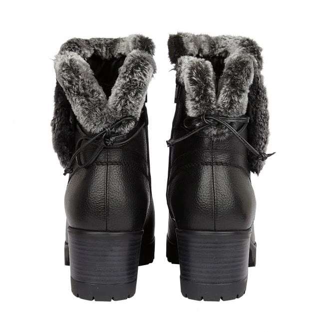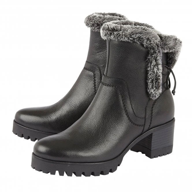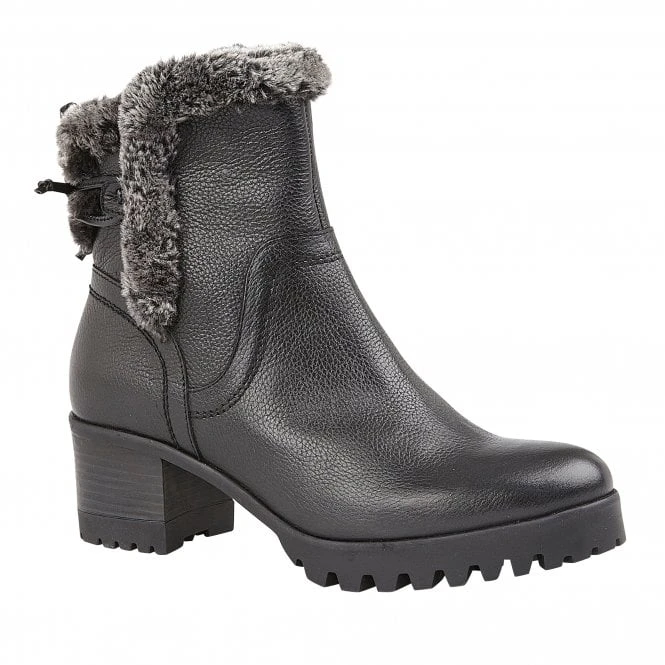 A perfect choice for the colder months is the Stressless by Lotus Suzy ankle boot. As well as featuring comfort attributes including shock absorbing properties and a padded insock, this women’s black leather ankle boot boasts distinctive touches that give it a seasonal vibe. The heavy cleated sole unit, the faux fur trim and collar, plus the sumptuous warm lining all come together to entice you to marry this Lotus heeled ankle boot with your chic cold weather looks.