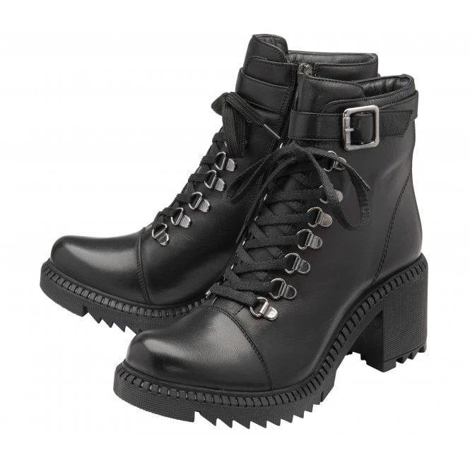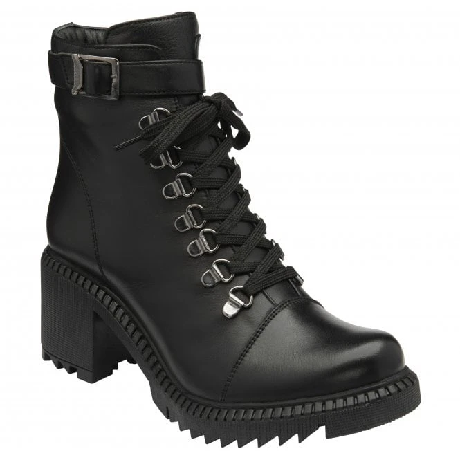 The walking boot gets a seasonal upgrade in the form of the Lotus Virginia boot. This on-trend offering is finished with a premium leather upper, D-ring lacing, an eye-catching wraparound buckle feature, a chunky cleated sole and a 7.5cm block heel to make this Lotus women’s black ankle boot a must-have in every capsule off-duty wardrobe.
