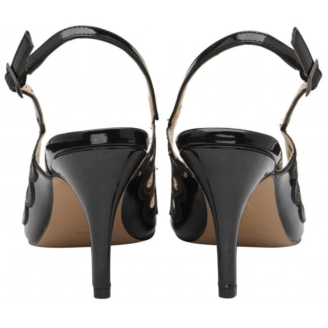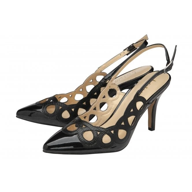 The Lotus Debbie court shoe embodies style and feminine chic. This sleek silhouette features a pointed toe, decorative circular cut outs that are trimmed by a subtle reptile print on the patent upper, a delicate adjustable slingback and a slender 9cm stiletto heel. This seasonless black court shoe that matches the Lotus Raine clutch bag exemplifies why any well-designed women’s court shoe is seasonless and offers endless wear.