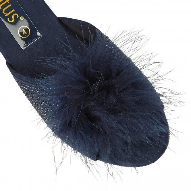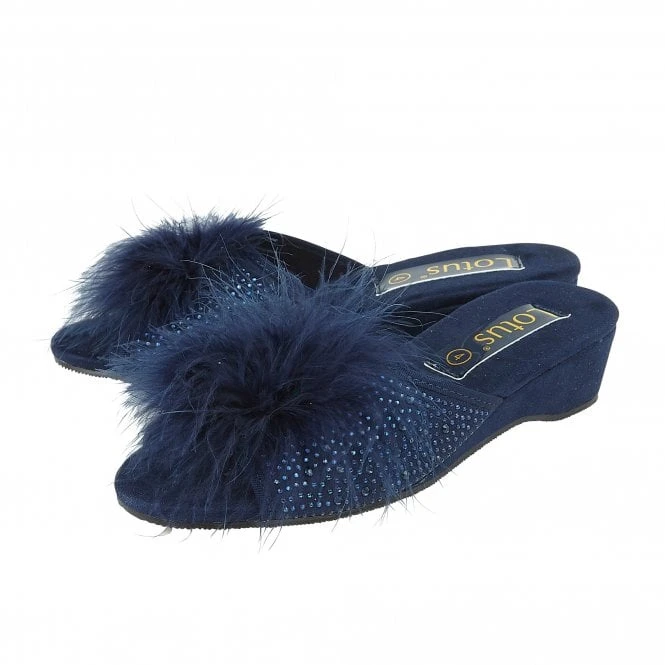 The ever popular Lotus Allure slipper gets an update to further accentuate its glamorous flair and appeal. As per its predecessors a striking feather pom-pom is incorporated, but this season’s new style sees the addition of sparkling diamantes adorning the microfibre upper. This open toe, navy women’s Lotus slipper also boasts a subtle wedge heel and an extra padded cushioned in-sock to make it exceptionally comfortable.