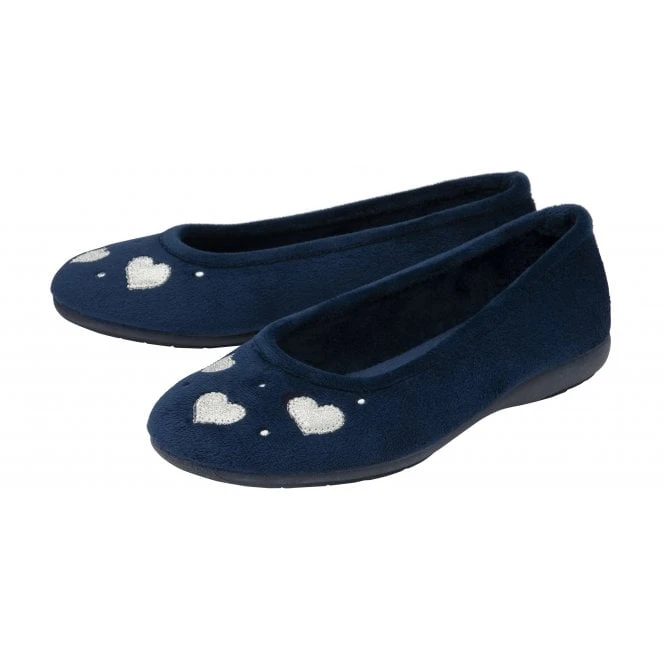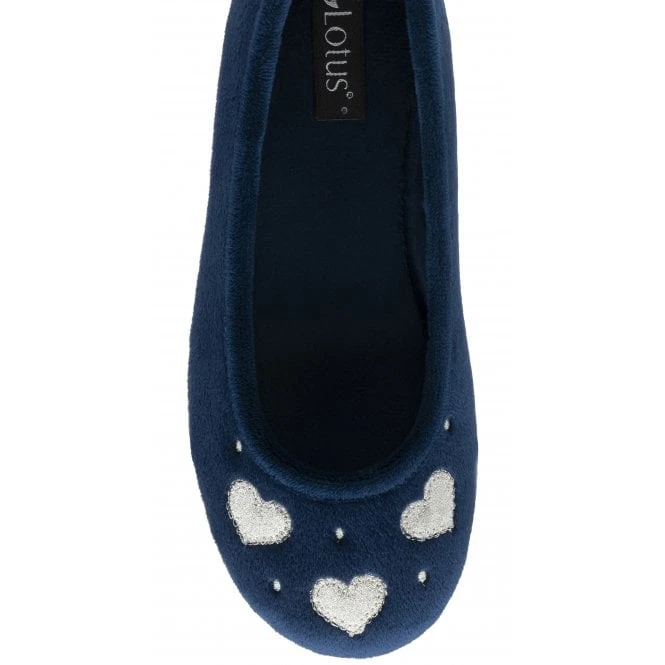 Giving the navy ballerina slipper Lois a delightful finishing touch are cute glitter love hearts and metallic embroidered spots. Crafted with a soft touch textile upper and lining, plus a rubber outsole for enhanced durability, this Lotus women’s full shoe slipper is as practical as it is stylish.Â