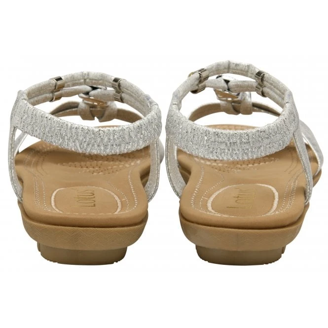 The women’s Lotus Bettina sandal is highly distinctive, exceptionally comfortable and promises 24/7 style on holiday! Enhancing the upper of this flat, open toe, silver sandal is polished metal hardware and imitation crystals. Comfort is amplified by the incorporation of a cushioned insock and an elasticated slingback.