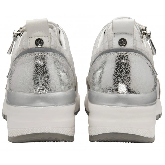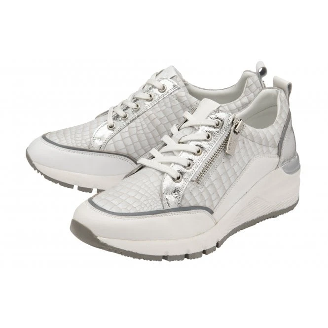 The Stressless by Lotus Sanford trainer will certainly give your friends shoe envy, not only because it looks great but because it is exceptionally comfortable too! This striking white lace-up sneaker is crafted from premium leather and boasts mock croc printed panels, metallic trims, an exposed zip and a crisp white 4.5cm wedge heel. Comfort is addressed by the inclusion of a padded ankle collar and shock absorbing properties have been incorporated within the cushioned insock. This Stressless by Lotus women’s trainer is highly wearable, superbly versatile and a must-have for any fashion minded individual!
