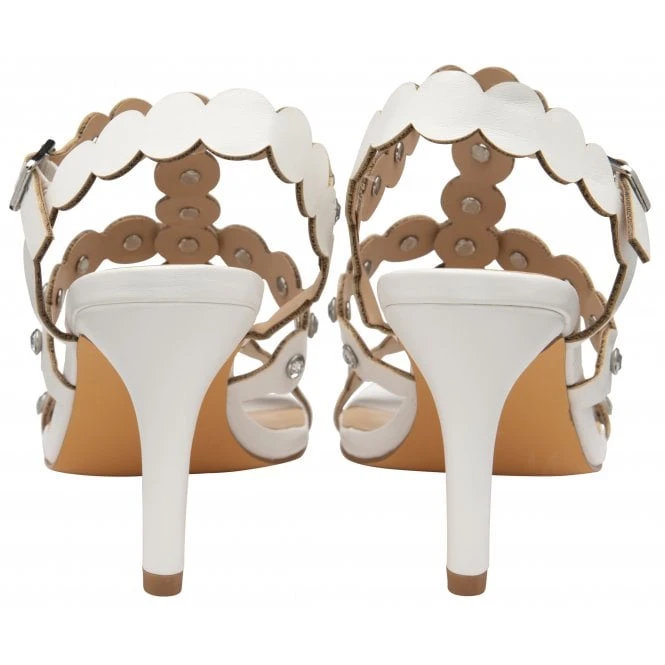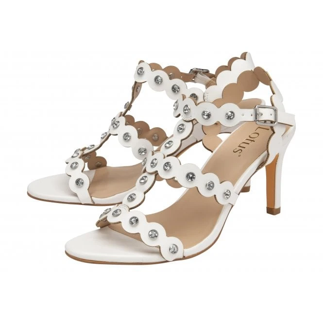 The Lotus Inaya open toe heeled sandal will add a dose of glamour to any warm weather looks. This women’s white sandal is crafted from faux leather and boasts straps that have been cut with a scalloped edge and each circle is finished with a sparkling gem centre piece. Nestled on a 9cm stiletto heel and featuring an adjustable ankle strap fastening, this Lotus ladies’ sandal is certainly worthy of a fresh pedicure.