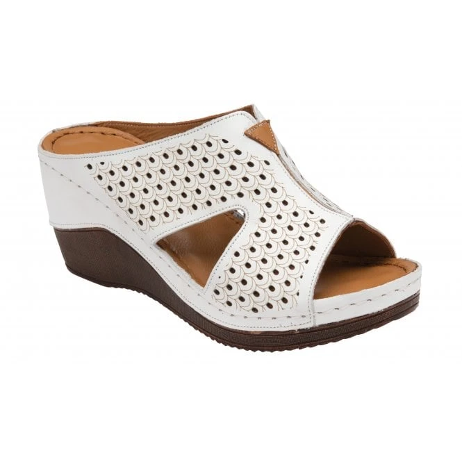 The Lotus Genevieve wedge mule is an exceptionally wearable style that is the perfect pairing to casual looks. Laser cut out detailing, delicate etching and contrast stitching enhance the leather upper of this slip-on, open toe white sandal. This Lotus women’s mule also boasts a leather lining, a cushioned in-sock and a wearable 7cm wedge heel.